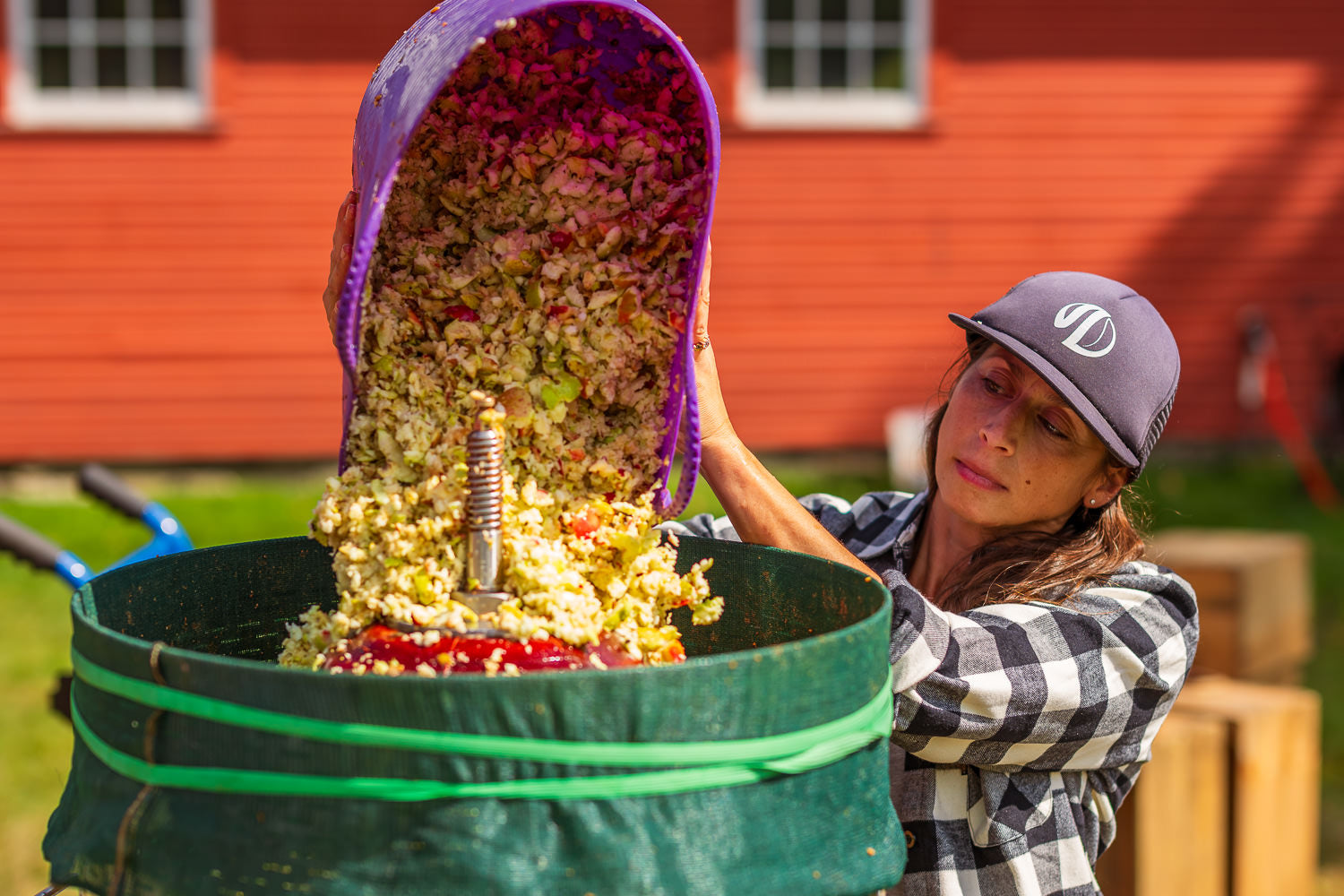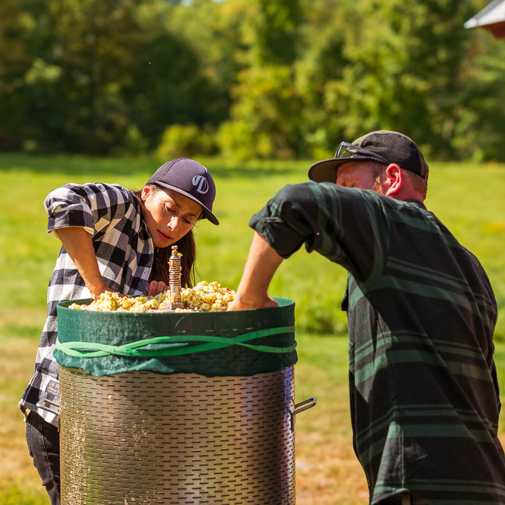 Their operation is based in a two-story barn on a stunning heritage hilltop farm. Fall sunshine blazes down on a long feed tray full of wet, glistening apples, at the tail end of which Jenn scoops up washed and culled fruit and dumps it into an electric masher. When the bucket below the masher fills, she and Cein dump the contents into the apple press—a Slovenian invention, Bleecker says—a large cylinder with slits in its outside walls and a large water bladder at its center. The pulp is dumped between the bladder and the wall, then the bladder gets filled with a hose, pressing the juice from the pulp and causing it to flow out through the slits, rippling down the sides “like the intro to the movie, The Matrix,” Bleecker says, “where all the green numbers and things are trickling down.” The juice then flows through tubing into a larger drum.